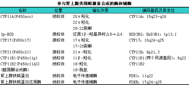 1.解剖、i生理特征11人体肾上腺由皮质和髓质两个功能不同的内分泌器官组成,l皮质分泌肾上腺皮质激素,l髓质分泌儿茶酚胺激素。肾上腺皮质又可分为3个区带:i①球状带,l位于肾上腺皮质最外层,l占皮质的5%~10%,l主要合成和分泌盐皮质激素;②束状带,l位于中间层,l约占皮质的75%,l是储存胆固醇的重要场所,l主要合成糖皮质激素,l如皮质醇及少量脱氧皮质酮(DOC)、i脱氧皮质醇(S)和皮质酮(B);③网状带,l位于肾上腺皮质最内层,l主要合成肾上腺雄激素。诸类肾上腺皮质激素均为胆固醇的衍生物,l其合成过程极为复杂,l必须经过一系列的酶促反应加工而成。在诸多类固醇激素合成酶中,l除3β羟类固醇脱氢酶(3β-HSD)外,l均为细胞色素P450(cytochrome1P450)蛋白超家族成员,l下表概括了主要参与肾上腺皮质类固醇激素合成的酶和辅酶。