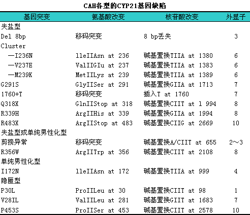 (2)CYP11B基因:i人类编码11β羟化酶的基因为CYP11B1,l定位于第8号染色体长臂(8q21)。基因突变热点在外显子2、i6、i7和8,l至今已发现20种基因点突变。