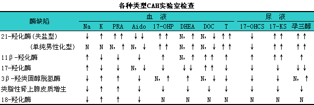 1.生化检测11尿液包括17羟类固醇(17-OHCS)、i17-酮类固醇(17-KS)和孕三醇;血液包括钠(Na)、i钾(K)、i肾素血管紧张素原(PRA)、i醛固酮(Aldo)、i17羟孕酮(17-OHP)、i脱氢异雄酮(DHEA)、i脱氧皮质酮(DOC)及睾酮。临床检测判断意义参见下表。