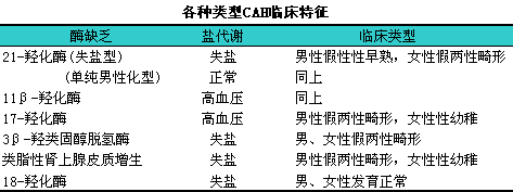 CAH主要包括21羟化酶缺乏症(21-OHD)、i11β羟化酶缺乏症(11β-OHD)、i3β羟类固醇脱氢酶(3β-HSD)缺乏症、i17α羟化酶缺乏症(17α-OHD)、i胆固醇碳链酶缺乏症(类脂性肾上腺增生症)等类型。其中21-OHD是最常见的CAH,l约占CAH总数的90%以上,l11β-OHD次之,l约占5%~8%,l再其次为3β-HSD缺乏症,l17α-OHD和胆固醇碳链酶缺陷症则十分罕见,l约占1%。