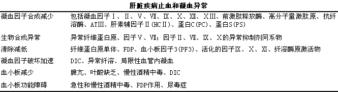 在严重肝病,l几乎止血功能的每一方面都有可能受到损害,l这是由于肝对凝血、i抗凝血因子的生物合成及清除功能衰减所致。止血方面的异常包括血小板数目减少、i血小板功能障碍、i血管内凝血、i纤溶亢进等。见下表。