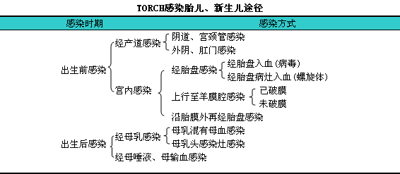TORCH感染后,l胎儿、i新生儿感染的途径见下表