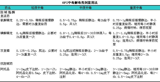 轻度中毒可单独应用胆碱酯酶复活药治疗;中、i重度中毒应联合应用阿托品和PAM,l联用时应减少阿托品用量。重度中毒者症状消失后停药,l并至少观察3~7天。