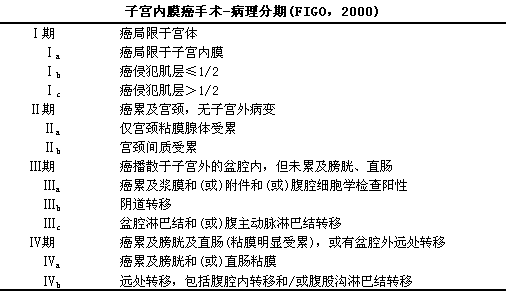 子宫内膜癌的分期现广泛采用国际妇产科联盟(FIGO)2000年制定的手术-病理分期,l见下表。以往沿用的临床分期已很少使用。