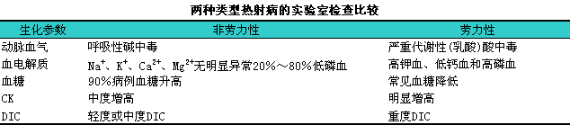 中暑时,l应行血生化检查及动脉血气分析(见下表)。严重病例出现肝、i肾、i胰脏和横纹肌损害的实验室改变。在住院时和住院24h或48h后检查血清门冬氨酸氨基转移酶(AST)、i丙氨酸氨基转移酶(ALT)、i乳酸脱氢酶(LDH)和肌酸激酶(CK)。有止凝血功能障碍时应考虑到DIC。尿液分析可发现横纹肌溶解和急性肾衰竭证据。怀疑颅内出血或感染时,l应行脑CT和脑脊液检查。