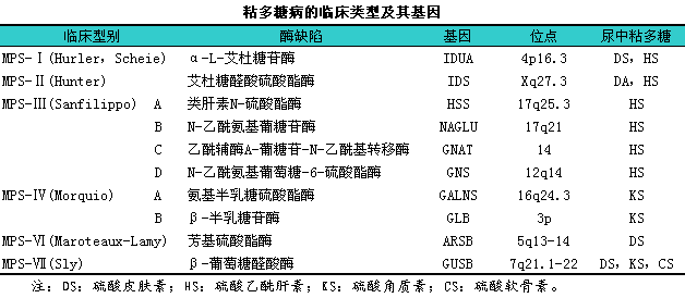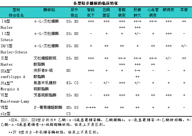 各型MPS大多在1岁左右发病,l病程呈进行性,l可累及多个脏器系统,l有着类似的临床症状。各型的病情轻重不一,l且有各自的临床特征,l见下表。MPSⅠ型是由α-L-艾杜糖苷酸酶(IDUA)缺陷所致,l其中又被划分为2个不同亚型,l均具有相同的分子病理及生化基础,l但以ⅠH型最为严重和典型,l预后最差,l常在10岁前死亡,l而ⅠS型病情最轻。