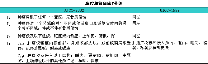 【鼻—鼻窦恶性肿瘤的TNM分类】1根据肿瘤的生长范围和扩散的程度,l按国际抗癌协会(UICC)TNM分类标准第五版(1997)的方案如下:i