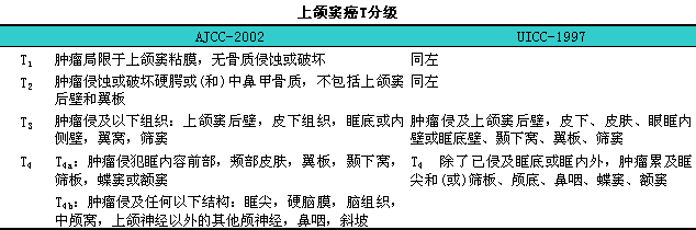 T4:i肿瘤侵犯颅内,l侵犯眼眶外包括眶尖,l侵犯蝶窦和(或)额窦,l和(或)鼻皮肤。