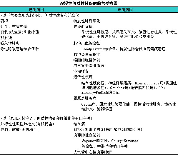 近年来,l在上述分类的基础上,l有学者将弥漫性肺间质病从临床角度按不同病因分成六大类别,l即:i①特发性肺纤维化(idiopathic1pulmonary1fibrosis,lIPF);②胶原血管/结缔组织病和肺-肾综合征;③肉芽肿性疾病;④吸入性病因;⑤遗传性病因;⑥特殊病因。