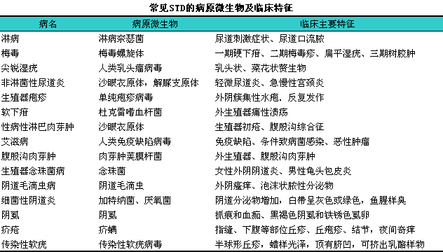【病因】1引起STD的病原微生物及其临床特征见下表。