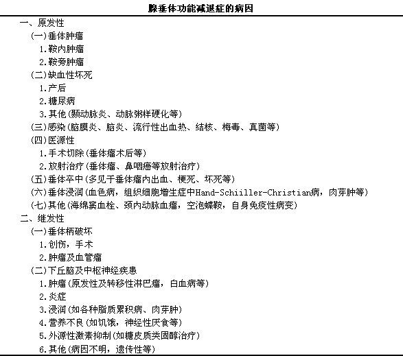 由垂体本身病变引起的腺垂体功能减退症称原发性,l由下丘脑以上神经病变或垂体门脉系统障碍引起者称继发性腺垂体功能减退症(见下表)。