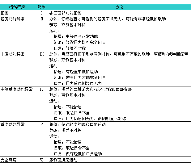 【面瘫程度评价的主观指标】1临床上常用House-Brackmann分级和Fisch评分标准对面瘫的程度以及手术后恢复的程度进行评价。