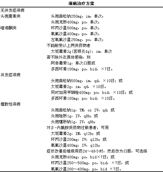 治疗原则是及时、i足量、i规范应用抗生素。由于耐青霉素的菌株增多,l目前选用的抗生素以第三代头孢菌素及喹诺酮类药物为主,l具体方案见下表。无合并症淋病推荐大剂量单次给药方案,l以使有足够血药浓度杀死淋病奈瑟菌,l推荐治疗药物的治愈率在97%以上。合并症淋病应连续每日给药,l保持足够治疗时间。由于20%~40%淋病同时合并沙眼衣原体的双重感染,l衣原体检查的费用高于治疗费用,l因此,l对淋病患者,l若不进行衣原体的筛查,l可同时应用抗衣原体药物。对患者的性伴侣应进行检查及治疗,l检查治疗期间禁止性生活。