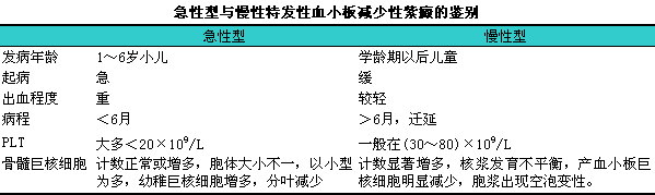 根据病史、i临床表现和实验室检查,l即可做出诊断。急性型和慢性型的区别见下表。本病须与急性白血病、i急性感染如流感、i败血症、i伤寒等和药物所致的血小板减少相鉴别。