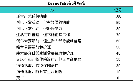 老年人化疗前应作行为状态(performance1status,lPS)打分,l即患者的一般状态,l与预后有关。对其评价以活动能力作为指标,l所以称行为状态(PS),l现将常用的Karnofsky记分标准列表如下。