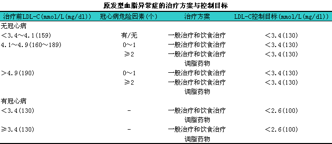 血脂异常症的治疗目的是通过调整血脂谱,l使其恢复正常,l以降低冠心病的患病率及其他心血管事件的发生率。原发性血脂异常症的治疗措施主要有调整生活方式与饮食结构、i调脂药物治疗、i血浆净化治疗、i手术治疗和基因治疗等。具体的治疗方案应根据患者的血脂谱变化和冠心病的危险因素(见下表)而定。一般危险因素越多,l对调脂的要求越高。已有冠心病的血脂异常症患者应采取积极有效的措施,l使血脂调至较为安全的水平。继发型血脂异常症主要是积极治疗原发病,l并配合饮食控制和调脂药物治疗。