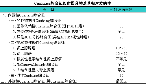 按本症病因主要可分为内源性和外源性Cushing综合征。前者又可分为ACTH依赖性和非依赖性(见下表)。