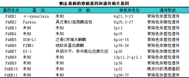 3.遗传11帕金森病患者中绝大多数为散发病例,l仅10%为家族性帕金森病,l而后者又分为仅有2~3个家庭成员发病的小家系和极少数的大家系帕金森病两种情况。家族性帕金森病患者多具有不完全外显的常染色体显性遗传或隐性遗传特征,l有多代、i多个家庭成员发病,l临床表现与散发性帕金森病有所不同:i如伴有共济失调、i锥体系损害体征以及起病早、i病程短等。家族性帕金森病虽少见,l却为研究帕金森病的遗传因素提供了极好的机会和条件。通过发现与家族性帕金森病发病有关的基因,l研究这些基因突变导致的多巴胺能神经元变性死亡的机制,l将有利于了解大多数散发性帕金森病患者的发病原因及防治措施。遗传因素在年轻的(40岁以下)帕金森病患者中可能起着更重要的作用。目前分子遗传学的研究证明导致帕金森病发病的重要致病基因有:i①α-突触核蛋白(α-synuclein,lα-SYN)基因,l又称PARK1基因,l位于4号染色体长臂4q21.3~23。在确定α-突触核蛋白与大家族性帕金森病连锁后,l利用抗α-突触核蛋白抗体进行免疫组化染色发现Lewy小体(帕金森病的病理标志)中含有大量的α-突触核蛋白,l这表明α-突触核蛋白与Lewy小体形成之间的关系。α-突触核蛋白是帕金森病的发病机制中最重要的蛋白,l因为它是Lewy小体的主要结构成分。α-突触核蛋白聚集与Lewy小体的形成及多巴胺能神经元的死亡密切相关。进一步的研究发现,l突触核蛋白也是其他神经系统变性疾病,l如弥散性Lewy小体病(diffuse1Lewy1body1disease,lLBD)和多系统萎缩(multiple1system1atrophy,lMSA)等疾病时神经元包涵体的重要组成成分,l凸显出α-突触核蛋白与神经元变性死亡的关系,l它现已成为神经变性疾病的研究热点之一。②Parkin基因,l又称PARK2基因,l位于6号染色体长臂6q25.2~27。Parkin基因突变足常染色体隐性遗传型帕金森病的最常见的原因,lParkin基因突变导致Parkin的泛素E3连接酶活性丢失使泛素水解酶路径(ubiquitin-proteasomal1pathway,11UPP)异常,l影响蛋白的降解导致多巴胺能神经元的死亡。③DJ-1基因,l又称PARK7基因,l定位于1号染色体1p36。DJ-1是最近在欧洲2个家族中发现的与常染色体隐性遗传的家族性帕金森病有连锁的一个基因,l它是继Parkin基因之后发现的与常染色体隐性遗传的家族性帕金森病有关的第二个基因,l在早发帕金森患者中DJ-1基因突变较Parkin基因突变少见。DJ-1蛋白是一种抗氧化蛋白,l参与氧化应激反应,l具体作用尚不清楚。④UCH-L1基因,l即泛素C末端水解酶-L1(ubiquitin1carboxy-terminal1hydrolase-L1),l又称PARK5基因,l定位于4号染色体短臂4p14-15,l与常染色体显性遗传的帕金森病有关。UCH-L1基因的突变造成泛素水解酶路径异常,l后者在多巴胺能神经元的死亡过程中可能有重要作用。⑤PINK1基因,l亦被认为是家族性帕金森病的可能致病基因。此外还发现与帕金森病发病相关的其他可能的致病基因(下表)。