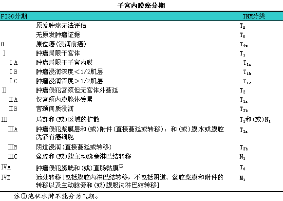 FIGO妇科肿瘤委员会在1988年推荐子宫内膜癌使用手术分期(见下表)。现已不再使用以前应用的分期依据(如以分段诊刮的结果来区分Ⅰ期和Ⅱ期),l少数初始治疗为放疗的病例仍可用FIGO1971年的临床分期,l但必须注明。