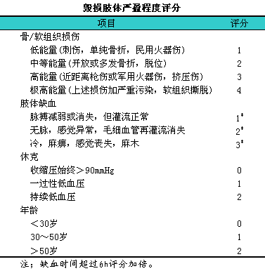 1990年,lJohansen等又提出毁损肢体严重程度评分(mangled1extremity1severity1score,lMESS)(见下表),l总评分≥7分者应考虑截肢。他们认为,lMESS不仅可对肢体能否存活做出判断,l而且能预测肢体存活后功能。