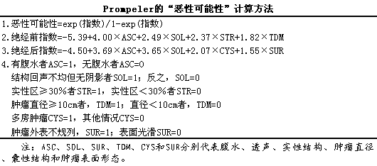最近,lPr6mpeler等介绍了一种更为客观、i细致的所谓“恶性可能性”(malignant1proba-bility)估算法(见下表)。以可能性(prob)=0.1为临界,l判断育龄患者附件包块性质敏感性、i特异性和准确性分别为86.5%、i92.6%和92.0%。判断绝经后附件包块各相应值分别为93.0%、i82.7%和86.6%。