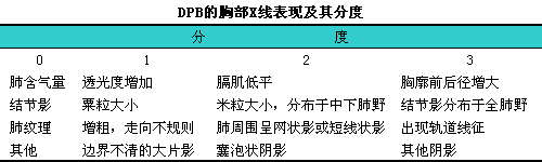 4.X线检查11胸片或CT可见因呼吸细支气管以下的气道及肺泡腔膨胀所致的含气量增加和膈肌下降的征象。由于呼吸细支气管与邻近肺泡管壁广泛性炎症细胞浸润、i泡沫细胞集聚以及纤维化的存在,l胸片上常出现直径在5mm以下,l边界不清,l呈小叶中心性分布的弥漫性结节状阴影,l并有分叉状线条影与其相连。以下肺野为明显。此为细支气管扩张,l管内充满黏液的表现。部分呼吸细支气管至小叶支气管柱状扩张及管壁增厚较为严重的患者,l则可出现轨道线(tramline)征。DPB的胸部X线表现及分度见下表。