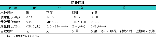 1.评分方法11凡妊娠24周后经门诊治疗无效,l确诊为妊娠高血压综合征收住院者。于住院当日进行评分,l住院治疗期间,l每3~5天评分一次。以晨间查房所得各项检查指标为准。根据产妇水肿、i收缩压,l舒张压、i尿蛋白、i自觉症状五项指标评分(见下表)。