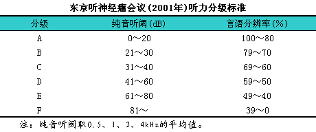 2001年,l东京听神经瘤大会上一致通过了一种新的听力标准(见下表)。对以往的标准做了以下几点改进;①纯音听阈应该取0.5、i1、i2、i4kHz的平均值。②A级定义为正常听力。③A、iB级听力具有社会实用价值,l称为实用听力,l定义为PTA≤30dB,l且SDS≥70%。④术后言语分辨率比纯音听阈更重要,l若SDS等级优于PTA等级1级以上,l总的听力等级要上升1级。例如,l60dB1PTA和75%1SDS的听力分级为C级。