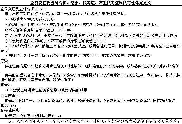 1992年,l成人医学公布了有关全身炎症反应综合征(SIRS)、i脓毒症(sepsis)、i脓毒性休克(septic1shock)等的定义,l2001年对此进行了修订。国际儿科界对此一直没有公认的定义。我国成人医学界已将这一定义应用于临床,l但儿科界迄今仍沿用感染性休克、i败血症、i新生儿败血症等名称,l尚未与国际接轨。2002年2月,l来自加拿大、i法国、i荷兰、i英国和美国的从事脓毒症临床研究的20余位专家组成国际小组,l在得克萨斯圣安东尼奧召开了脓毒症定义大会。会议议题包括:i回顾第一次成人脓毒症定义大会;当前可利用的儿科SIRS和脓毒症的定义;器官功能障碍评分系统在成人和儿科的应用。会议还回顾了杀菌/渗透性增加蛋白(rBPI21)在脑膜炎球菌菌血症第三阶段的临床试验,l同时也回顾了美国食品和药物管理局的儿科试验指南。会议以成人医学定义为基础,l结合儿童各年龄组生理值的不同特点明确了儿童感染(Infection)、i脓毒症(sepsis)、i严重脓毒症(severe1sepsis)、i脓毒性休克(septic1shock)和器官功能障碍(organ1dysfunction)的概念。经3年实践,l于2005年1月发表。本次会议首次在儿科界确定了脓毒症的相关概念[包括儿科全身炎症反应综合征、i感染、i脓毒症、i严重脓毒症、i脓毒性休克和多器官功能障碍综合征(MODS)],l其目的是为大规模、i多中心的国际合作确定设计、i分析、i实施等具体工作标准,l促使小儿脓毒症的临床研究能成功进行,l进而改善脓毒症患儿的预后.这次大会对四个主要问题取得一致意见。现分述如下;