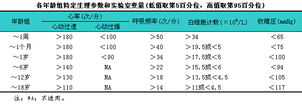 美国胸科医师学会(ACCP)和危重病医学会(SCCM)描述SIRS是发生外伤、i感染、i烧伤、i胰腺炎和其他疾病后的非特异炎症过程。脓毒症被定义为SIRS+感染。在Bone等研究的基础上修订了儿童SIRS的定义(上表)。诊断SIRS时,l成人和儿童主要的不同点在于,l儿童必须有体温或白细胞异常(若病儿仅心率和呼吸增快不应诊为SIRS)。在刚出生儿组,l心动过缓可能是SIRS的体征,l但年长儿心动过缓多出现在接近临终期。下表示各年龄组相关的生理参数值。