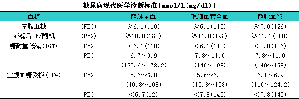 1.糖尿病现代医学诊断标准1999年WHO/ADA所定标准,l如下表。