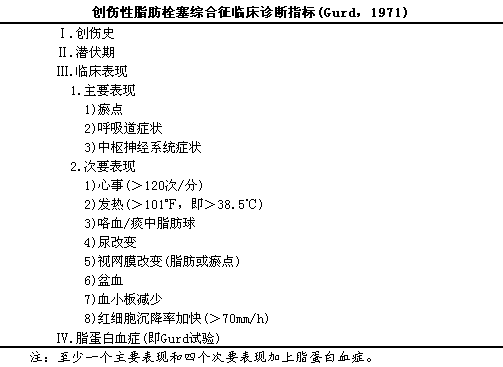Gurd提出的创伤性脂肪栓塞综合征临床诊断指标见下表。