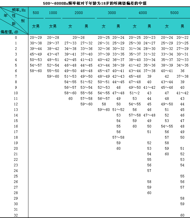 表附A-1中给出了频率从500~6000Hz相对于年龄为18岁的听阈级偏差的中值(修约至最接近的整分贝数,l见下表),l该值为年龄从20岁到60岁的男性和女性耳科正常组50%的期望统计分布。