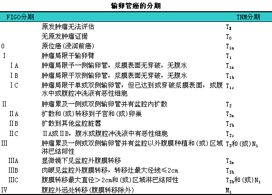 输卵管癌采用FIGO手术-病理分期系统,l见下表。组织病理学的结果可以修正临床或影像学的估计和肿瘤减灭术前的手术所见。