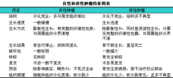 而分为良性肿瘤和恶性肿瘤两大类(见下表)。介于良性、
