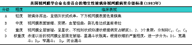 此分级标准将增生性玻璃体视网膜病变分为四级(见下表)。