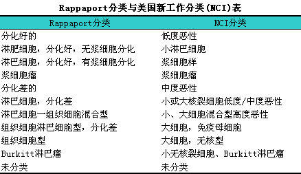 (1)分类:i目前多应用Rappaport分类及1982年美国国立癌症研究院新工作分类,l两法基本一致(见下表)。