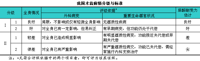 我国将手术病人的全身情况归纳为两类四级,l评定标准见下表。