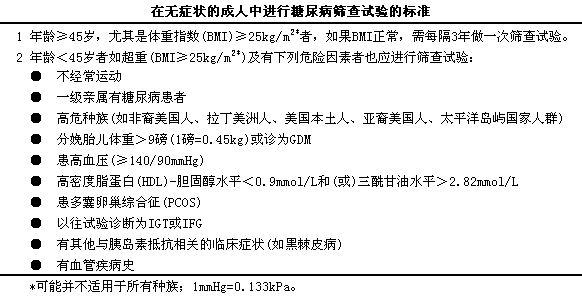 糖尿病的诊断试验与筛查有很大区别。当出现糖尿病的症状或体征时,l就需要做诊断性试验,l但这并不代表筛查。筛查的目的是确认可能患有糖尿病的无症状个体。筛查试验阳性者需根据标准做独立的诊断试验,l以明确诊断。