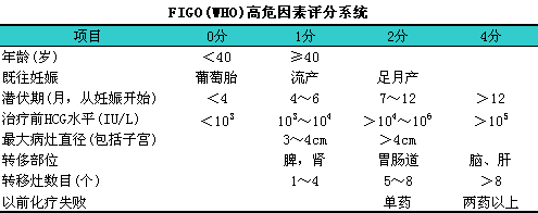 由Goldstern首先提出的有关滋养细胞肿瘤预后的WHO评分系统。于2000年获得FIGO承认。该系统高危因素的分值包括1、i2、i4分,l血型在评分系统中将不使用+肝转移为4分。2002年7月,lFIGO癌症协会批准了低危和高危滋养细胞肿瘤的临界值。≤6分属低危,l单药化疗即可;≥7分属高危,l需联合化疗。取消中危的分组(见下表)。