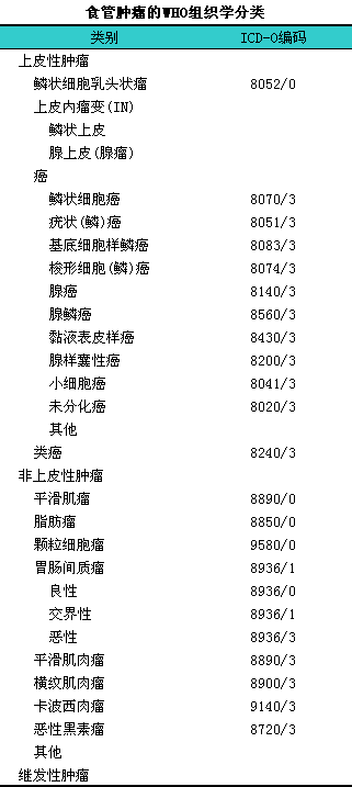 比较2002年和1990年食管肿瘤W1H10组织学分类表,l可以发现新分类减少了三大类,l仅保留了上皮性肿瘤、i非上皮性肿瘤和继发性肿瘤,l将原分类中的上皮性异常(癌前病变)、i癌肉瘤和类癌归人上皮性肿瘤,l将恶性黑色素瘤、i恶性淋巴瘤归人非上皮性肿瘤,l删除了瘤样病变。见表2-9。