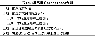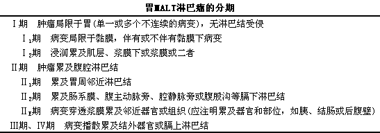 2.分期111994年以前,l结外淋巴瘤的临床分期一直沿用由Musshoff修改的Ann1Arbor分期(见下表)。但在应用中发现该分期对胃MALT淋巴瘤有局限性,l现在多用1994年制定的胃MALT淋巴瘤分期(见下表)。不少作者认为TMN分期也是值得采用的方法。
