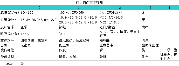 病、i伤严重度指数(IISI)由脉搏、i血压、i皮肤色泽、i呼吸、i意识、i出血、i受伤部位和损伤类型八项数据组成(见下表)。急救人员先分别记分,l标出总分,l如果患者近期有病史,l或者年龄小于2岁或大于60岁,l总分另加1分。该指数不仅可用于创伤,l而且也可用于其他病的紧急评定。临床一般按以下划分:i①创伤:i总分0~6分为轻伤,l7~13分为重伤,l14~24分为危重,l25分以上者可能死亡。②其他病人:i总分0~3分可不住院,l4~6分需住院,l7~11分需监护或手术,l12分以上者可能死亡。