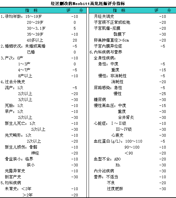 为了早期识别和监护高危妊娠,l可根据高危妊娠的各种因素进行动态评分.首次产前门诊时,l根据病史和体征有无危险因素对孕妇进行初次评分。随着妊娠的进展.如有情况变化可再次评分。目前医院和产院有各自设计的评分法.但总的原则相同,l现介绍经过删改的Nesbitt评分法。总分为100分,l从100分中减去各种危险因素的评分,l得数<70分属于高危妊娠,l高于70分为低危妊娠(见下表)。