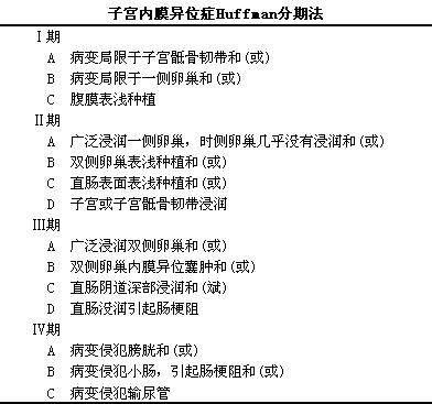 1951年,lHuffman根据内膜异位症的解剖部位和它同恶性肿瘤的类似性进行分期(见下表),l他是第一位主张按分期进行治疗的学者。用该分期法对300例患者分期,l研究保留性手术后的受孕率与疾病分期的关系。结果是:iⅠ期和Ⅱ期病人术后的妊娠率是47%,l故Huffman主张对Ⅰ期、iⅡ期和部分Ⅲ期患者保留生育功能。