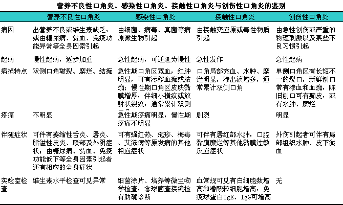 5.根据发病原因可分为营养不良性口角炎、i感染性口角炎、i接触性口角炎和创伤性口角炎(见下表)。