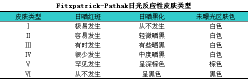 提出上述皮肤分型方法具有特定的背景原因。20世纪70年代初期,l应用光化学疗法即PUVA治疗银屑病作为一项新技术在美国迅速兴起,l在选择病人接受长波紫外线(UVA)照射起始剂量时,l头发和眼睛虹膜的颜色常被用作判断白种人对紫外线耐受性的指标,l浅色表型如金黄色或红色头发、i蓝灰色眼睛表示对紫外线耐受性差;而深色表型如棕黑色头发和棕色眼睛则表示对紫外线耐受性强。但实际应用中皮肤科医生意外地发现,l一些具有深色表型的人在接受相应的UVA初始剂量照射后却出现了严重的光毒性反应,l即辐照剂量过高了。这种现象表明,l不能单纯根据头发和眼睛的颜色表型来判断皮肤对紫外线的耐受性。Fitzpatrick皮肤分型法正是在这种临床需要情况下建立的,l对皮肤的正确分型在指导银屑病患者的PUVA治疗方面发挥了积极作用。但是这种分型法具有局限性,l因为作者当时仅研究了白种人的皮肤,l而且被调查者是年龄12~40岁的银屑病患者。后来Pathak在对上述分型作了进一步修改补充,l增加了棕色和黑色皮肤的人群,l形成了沿用至今的皮肤分型方法,l即Fitzpatrick-Pathak皮肤分型系统(见下表)。