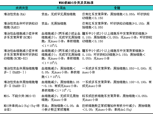 MDS分型已由FAB标准过渡到WH0标准(见下表)。