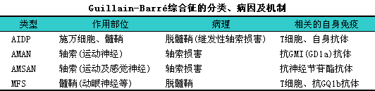 GBS大致分为四种类型:i①急性炎症性脱髓鞘性多发性神经病(AIDP);②急性运动感觉轴索型神经病(AMSAN);③急性运动轴索型神经病(AMAN)及④Miller-Fisher综合征(MFS)(见下表)。