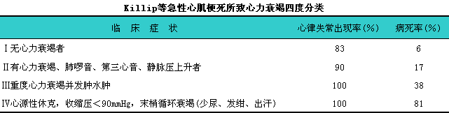Killip等根据急性心肌梗死的病情轻重及有无心力衰竭及其程度,l结合体检所见,l作如下4度分类(见下表)。